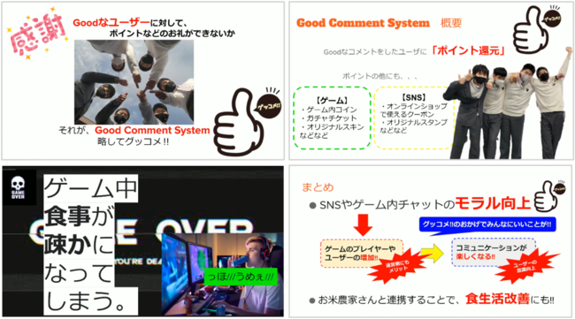 コメントに対して通報といった手段で対処するのではなく、グッドコメントをした利用者に対して報酬を与えようというものでした。また良いコメントをすることで、ゲーム内通貨やオンラインショップでのセール券を獲得できる仕組みを整備するだけでなく、食生活が偏りがちなゲーマに対しも、地元茨城のお米を食べて健康になってもらいたいという想いをのせて、お米と交換できる仕組みも盛り込んでいました。