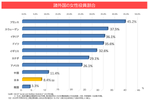 また、以下の図から諸外国と日本の女性役員比率を見ても圧倒的に日本が低いことがわかります。このような課題を受けて、日本政府は2014年より女性活躍に関する方針を定めるなど、ジェンダーは関係なく、男性と同様に女性が活躍できる体制作りを行うなど、国全体で女性活躍に関する意識が高まっています。