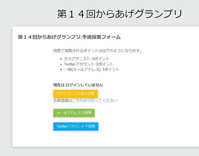 カラアゲ二ストのアカウントでログインし、投票よろしくお願いいたします!