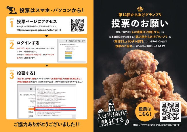 現在、唐揚げ専門店「人は唐揚げに熱狂する。」は、日本唐揚げ協会が主催する「第14回からあげグランプリ」の「東日本しょうゆダレ部門」にエントリー中です。