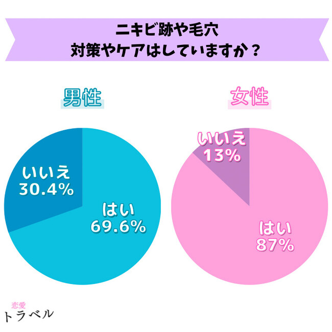 ニキビ跡や毛穴のケアについて「している」と回答したのは、男性が約7割/女性が約9割という結果になりました。