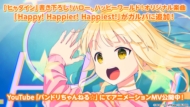 株式会社Craft Egg(本社:東京都渋谷区 代表取締役:森川 修一、以下、Craft Egg)と、株式会社ブシロード(本社:東京都中野区 代表取締役社長:橋本 義賢、以下、ブシロード)の共同制作によるスマートフォン向けゲーム「バンドリ! ガールズバンドパーティ!」(以下、ガルパ)は、2022年6月30日(木)より、アーティストタイアップ第5弾として「ハロー、ハッピーワールド!×ヒャダイン」を実施し、ヒャダインさんからハロー、ハッピーワールド!への提供楽曲『Happy! Happier! Happiest!』をゲーム内に追加いたしました。