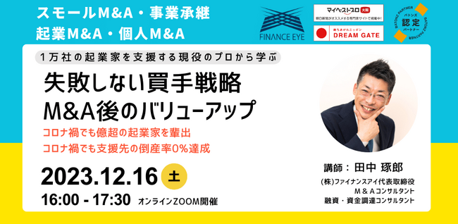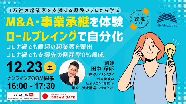株式会社ファイナンスアイ(本店:大阪府大阪市、代表取締役:田中 琢郎。以下、ファイナンスアイ)は、個人M&A、スモールM&A、事業承継に特化したユニークなセミナーを開催します。このセミナーでは、ロールプレイングを通じてM&Aのプロセスを実践的に学ぶことができます。参加者は、ケーススタディに基づいてM&Aの案件リサーチからM&Aの実行までの一連の流れを疑似体験することで、理論だけでなく実践的な知識も深めて自分事化することができます。M&Aや事業承継に関心を持つ個人、起業家、経営者、投資家、コンサルタントにとって、このセミナーは価値ある機会となるでしょう。開催日は年の暮れの2023年12月23日(土)です。年末年始の休暇前に学んで来年に向けて動き出せるように配慮しました。