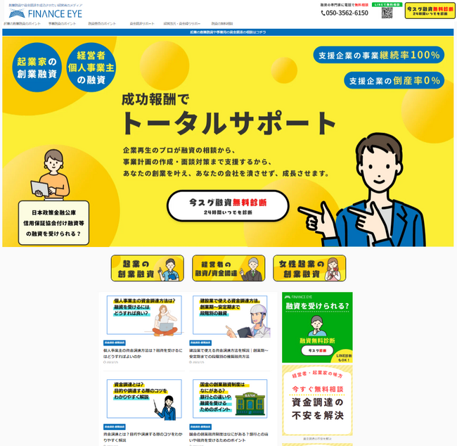 ファイナンスアイは、「1社でも多くの企業にファイナンスという活力を。継続的に成長していく支援をする事で、日本経済に貢献。」を理念に、起業家・個人事業主・中小企業の経営者に対し、成功報酬型で資金調達を支援しています。厳しい状況にある経営者にも積極的なサポートを行い、支援先はコロナ過にも負けず高い生存率を誇ります。ゼロゼロ融資による中小企業の倒産増加が顕在化してきた今、日本全国の経営者から毎日届く資金の悩み相談に対応し続けています。運営するWEBのオウンドメディアや各種SNSやLINE公式アカウントを通じて、大手金融機関出身者や財務コンサルタント、M&A支援機関のメンバーが監修した有益で視聴者や読者に分かりやすい情報を発信し続けています。サイトでは、融資が実現できる可能性を無料で診断するコンテンツも提供しており、毎日多くの経営者や起業家の皆様にご利用頂いています。ファイナンスアイでは資金調達だけではなく、経営者の様々な相談にも応じています。経済産業省中小企業庁のM&A支援機関登録制度にも登録済で、事業承継や小規模事業承継などによるM&Aの支援もしており、企業再生や経営改善といった困難な状況下で多くの経営者を支援してきた経験と知識を活かし、生存し続ける未来志向のサポートを提供しています。今回、日本最大級のM&Aプラットフォームである『BATONZ(バトンズ)』の認定パートナーとして活動を開始した事で、これまでの資金調達やファイナンスの支援にプラスして、中小企業の事業承継やスモールM&AやM&Aによる起業や個人のM&Aの支援を通通して、スタートアップの創出と育成、地方創生と日本経済の発展に寄与してまいります。