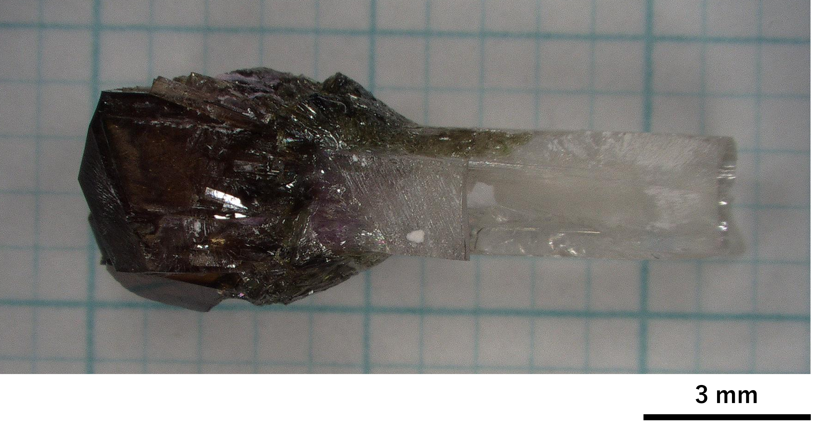 (左側の黒い部分がFZ法で育成した結晶、右側の白い部分はFlux法で合成された種結晶)
