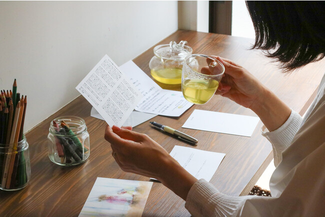 セットには手紙を書くためのポストカードだけでなく、振り返りのための質問が書かれたリフレクションカード、さらには一杯分の飲み物が含まれています。