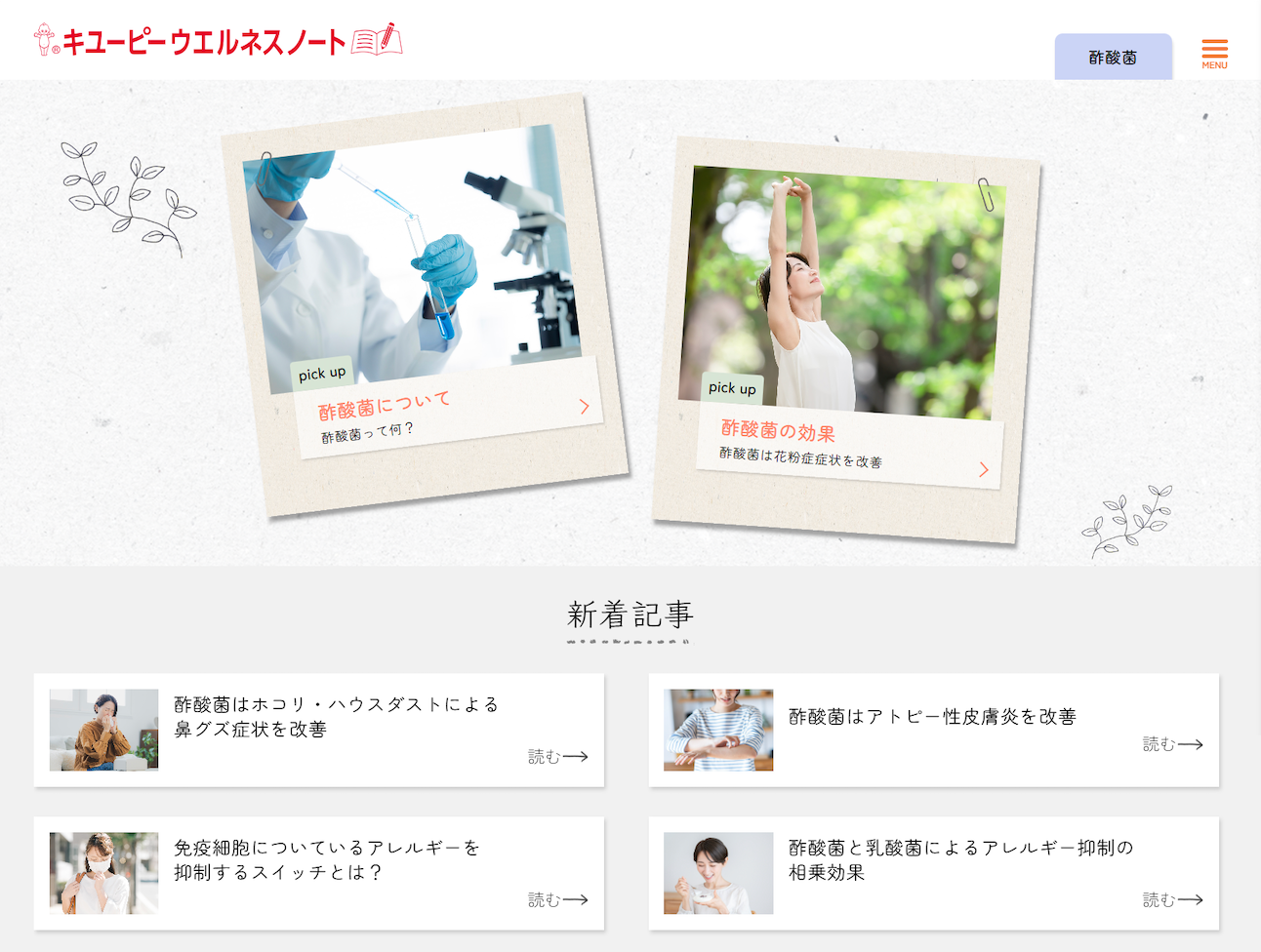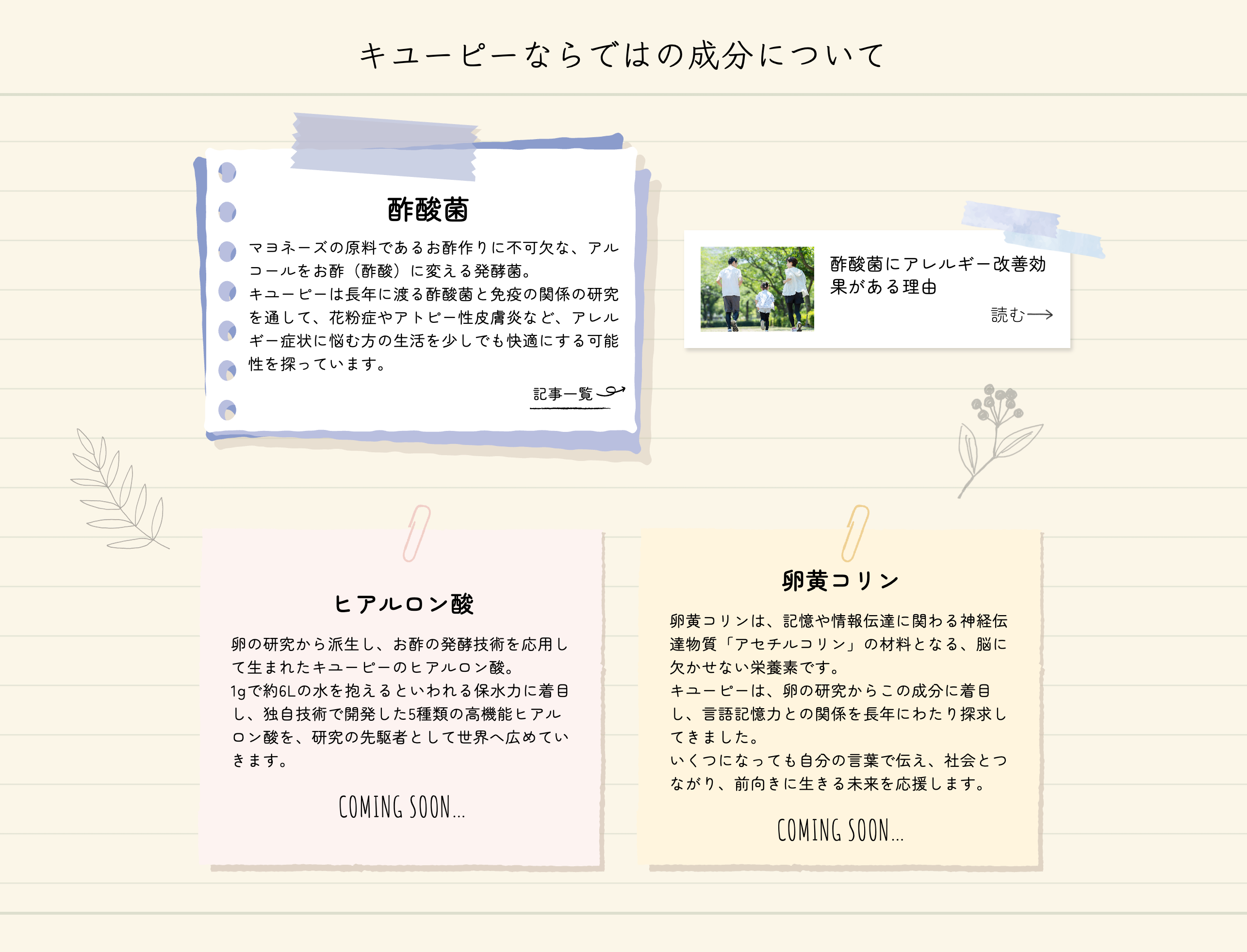 成分の魅力や効果をわかりやすく深掘りするメニューでは、公開時点では酢酸菌に関する記事を中心に、成分の正しい知識をお届けします。今後は、ヒアルロン酸や卵黄コリンなど、キユーピー(株)の長年の研究にもとづく成分の記事を順次追加していく予定です。