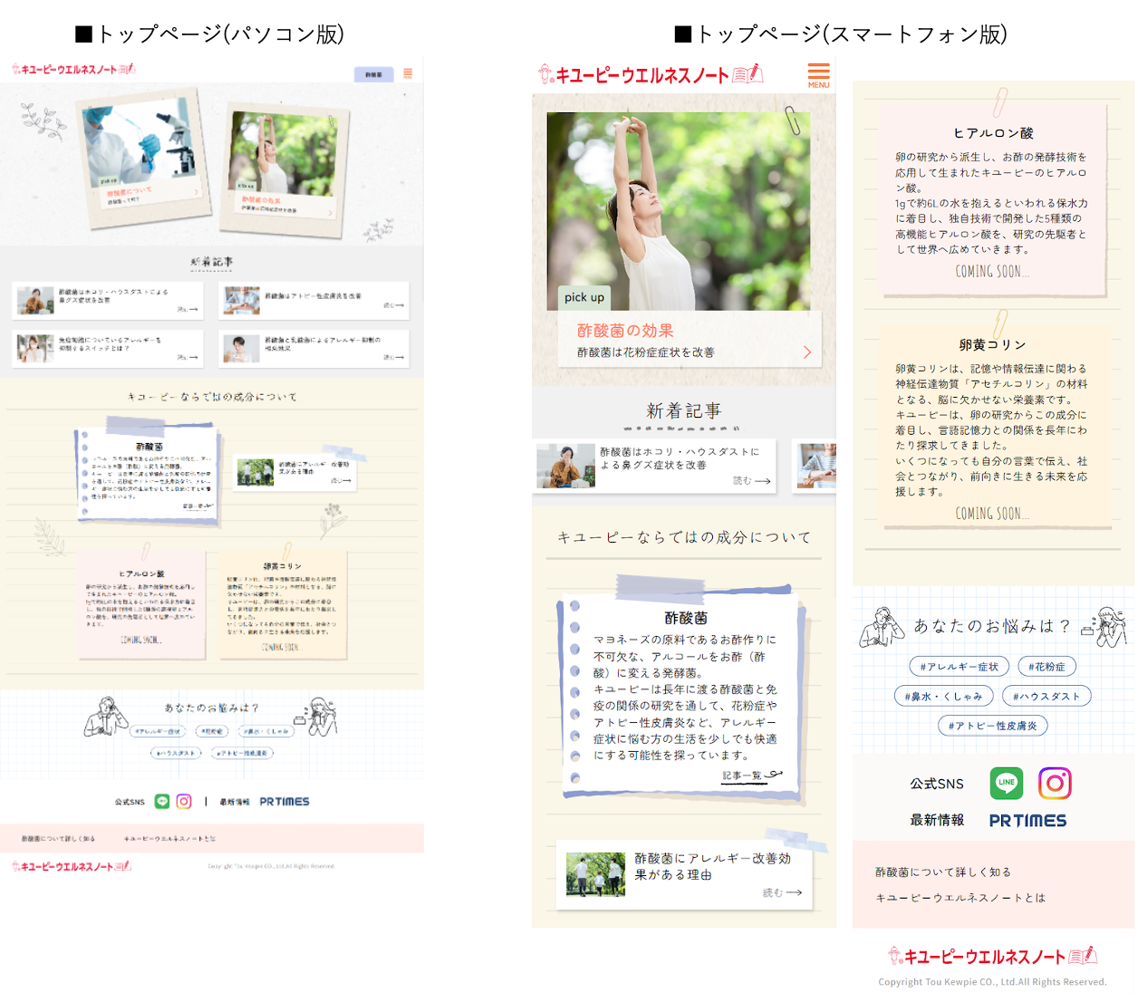 「キユーピーウエルネスノート」では、キユーピー(株)の独自成分(酢酸菌、ヒアルロン酸、卵黄コリン)に関する記事に加え、気軽に楽しく読めるインタビュー記事や健康・美容関連の記事を順次拡充し、キユーピーウエルネスをより身近に感じていただくことを目指します。