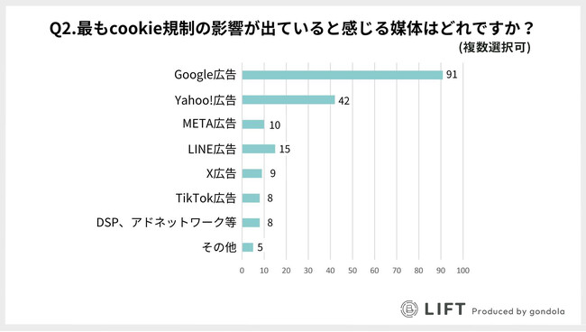 最もCookie規制の影響が出ていると感じる媒体について調査したところ、Google広告が最も影響を受けていると感じている広告主が多く(約75%)、次いでYahoo!広告(約34%)が続いています。