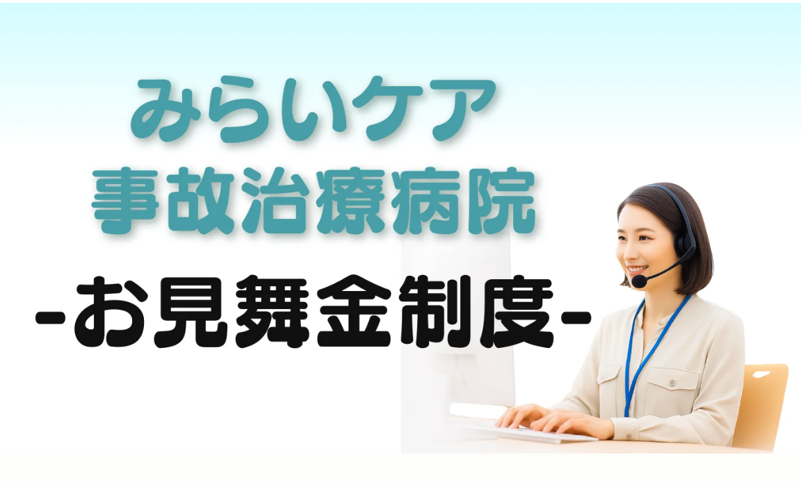 みらいケア事故治療病院では、当サイトをご利用いただいた方に向けて「お見舞金制度」を活用いただけます。