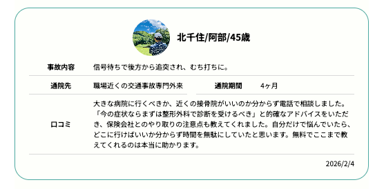 上記以外の、交通事故治療に関するあらゆるご相談に対応しているため、初めての交通事故でご不安な方にも、安心・簡単にご利用いただけます。