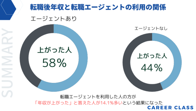 ・転職エージェントを利用した人の方が転職エージェントを利用していない人と比べて「年収が上がった」と答えた人が14.1%多いという結果になりました。