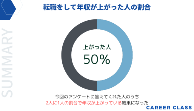 ・転職して年収が上がった人の割合は50%という結果になりました。