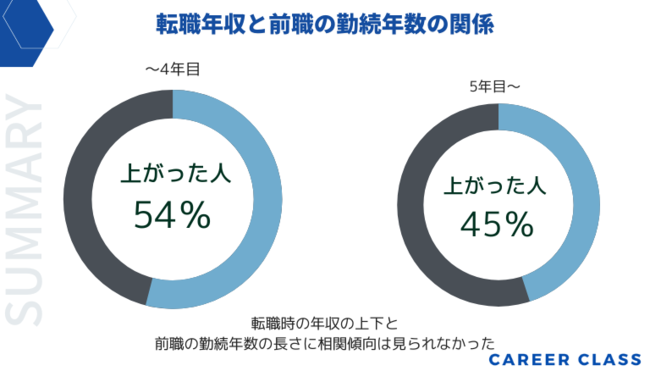 ・前職の勤務年数が長いほうが転職時の年収が上がりやすいという傾向は見られませんでした。
