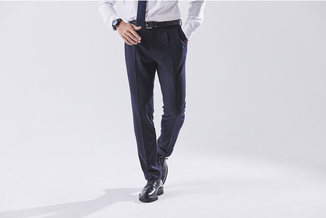 上質でしっかりと目の詰まったジャージー素材が、織物と見間違えるほどの光沢とドレッシーな表情を作ります。ジャージーだからこそ伸縮性があり、ストレッチの効いた快適な穿き心地を実現しています。