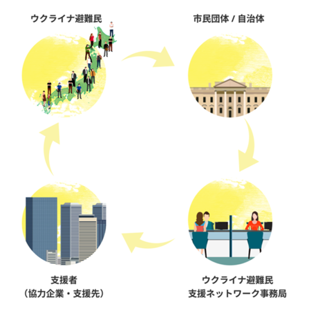本団体は、被支援者となる「自治体」や「市民団体」と「協力企業」の間に立ち、ウクライナから日本国内へ避難されている方々に対し、必要な物資支援を実施するために活動を行うもので、Yahoo! JAPANは、受け入れ先のニーズの集約やマッチングに対応する事務局を務めます。