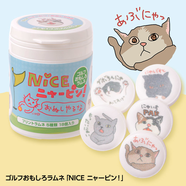 株式会社アンバリッド(大阪府大阪市)が、運営するゴルフコンペ景品ショップ「エンタメゴルフ」にて、ネコ×ゴルフをテーマにしたイラストをプリントしたおもしろラムネ「 NICE ニャーピン!」の販売を開始しました。本商品は、エンタメゴルフのオリジナル企画商品「ゴルフおもしろラムネ」の第2弾で、ニアピン賞や参加賞など、ゴルフコンペの景品にぴったりのアイテムです。