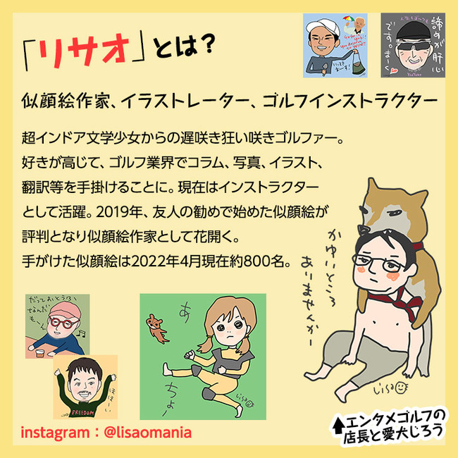 リサオは、ゴルフインストラクターとして活躍する似顔絵作家でイラストレーター。