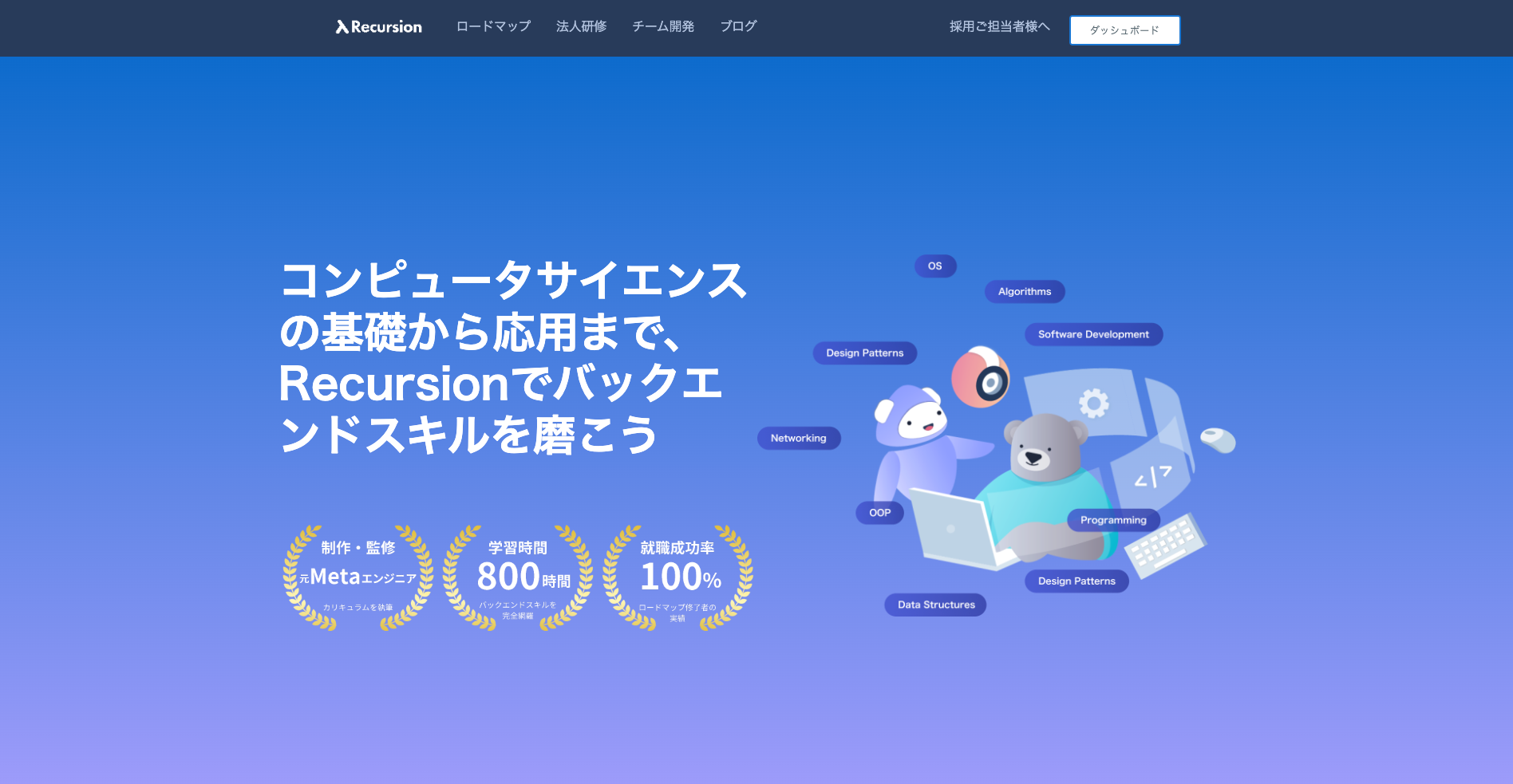 Recursionは、アメリカの大学におけるコンピュータサイエンス課程を参考に、元Metaのソフトウェアエンジニアによって立ち上げられたオンライン学習サービスです。アウトプットを重視した学習設計を採用しており、コンピュータサイエンスの基礎から応用までを体系的かつ効率的に学べる点が特徴です。