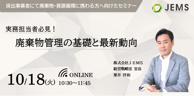 「ITで環境問題に挑む」をコーポレートスローガンに掲げる株式会社JEMS(本社:茨城県つくば市、代表取締役:須永裕毅)は、2022年10月18日(火)に排出事業者の廃棄物管理担当者様向けに、廃棄物管理の基礎や法改正などの最新動向を解説する無料のオンラインセミナーを開催します。