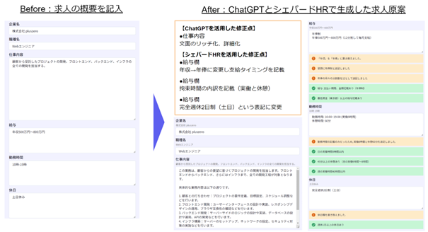 これに対して、同じ内容をプラスゼロがAEIを活用して開発した求人広告・求人票向けルールチェックサービスのシェパードHR(https://shepherdhr.jp/)とChatGPTとを組み合わることで、下記のようにChatGPTのみで発生していた1.2.3.の問題を解消した求人広告を自動で作成することが出来ます。