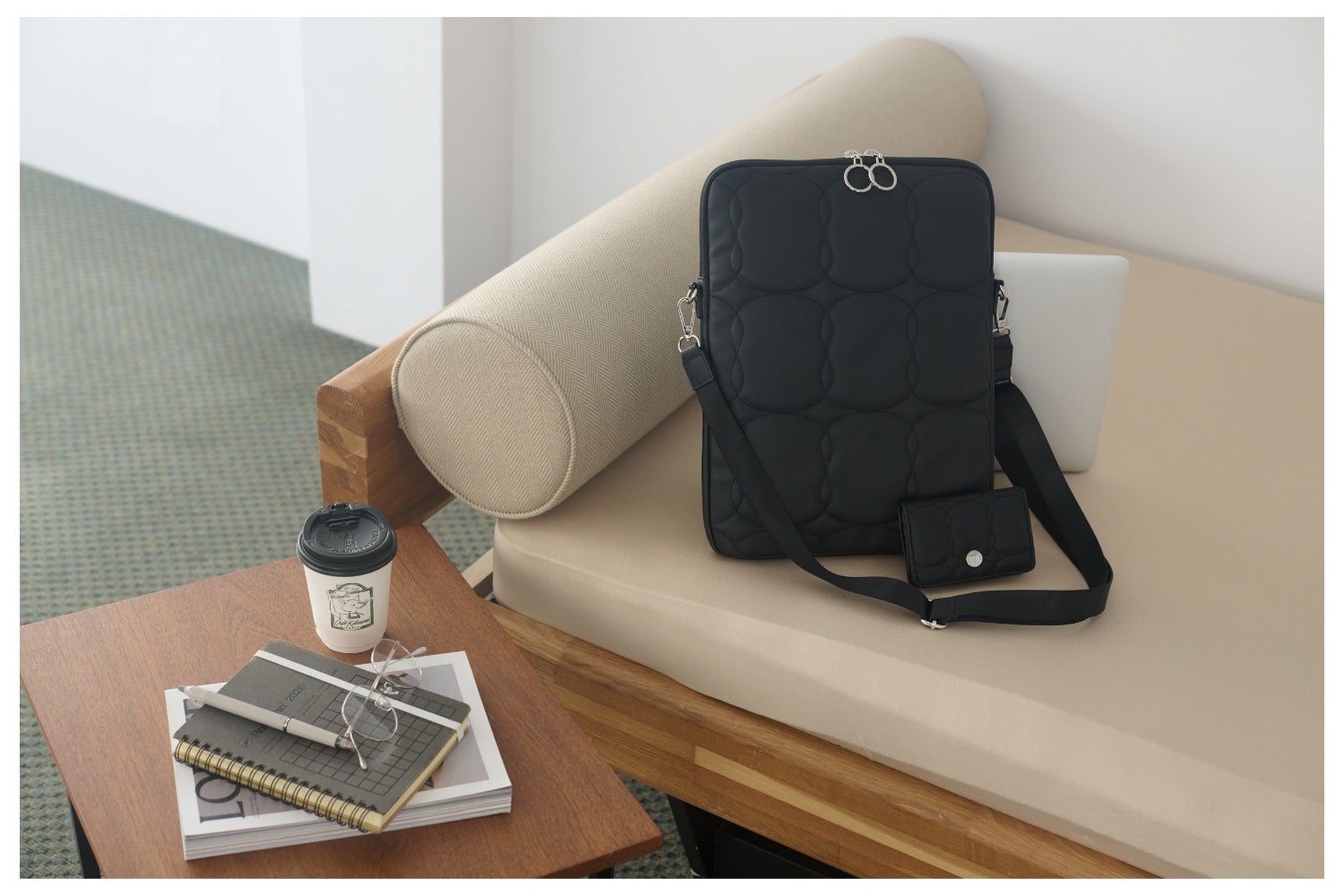 ブランドを象徴するOのマークを彷彿とさせる、リング状の引き手がデザインのアクセントに。さらに、柔らかなキルティングはデザイン性だけでなく、パソコンを衝撃から守ってくれる機能性も備えています。