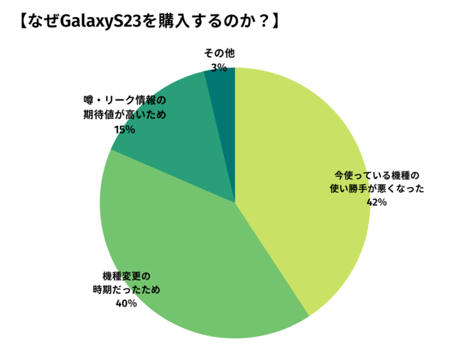 GalaxyS23を買いたい”と回答した人に「なぜGalaxyS23を購入するのですか?」とアンケートしたところ、下記のような結果となりました。