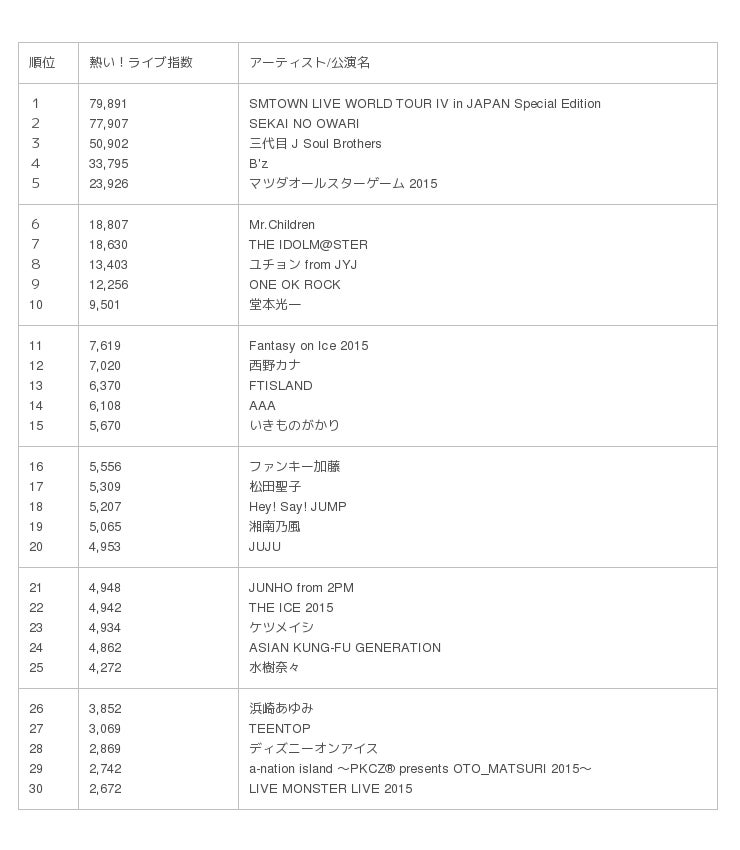 「2015年7月:熱い!ライブ指数ランキング」を発表 ―音楽、野球、アイススケート、ゲームとエンタメ勢ぞろい!―