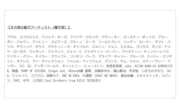 また、洋楽のみならず邦楽もしっかりカバー。多くのヒット曲を世に送り出している宇多田ヒカル、スピッツをはじめ、新時代を築いたEXILE、三代目J Soul Brothers from EXILE TRIBE、国民的シンガーシングライターの平井堅、星野 源、西野カナ、今や海外に活躍の場を広げているきゃりーぱみゅぱみゅやPerfumeなど、日本の音楽シーンを象徴する面々となっています。