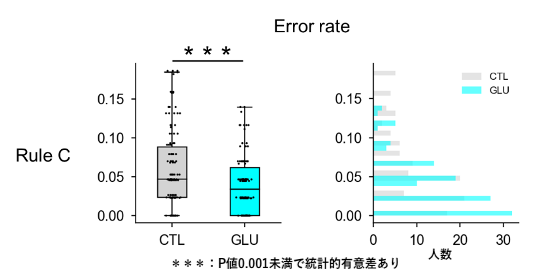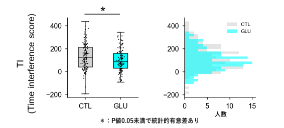 SCWTの成績を評価する指標として、時間干渉指数(TI:課題CWの反応時間 – (課題Wの反応時間 + 課題Cの反応時間)/2)及びエラー率、正解総数を用いました。その結果、ぶどう糖摂取群はコントロール群に比べ、時間干渉指数TI及び課題Cのエラー率が有意に小さいことが分かりました(図1)。一方で、課題Wと課題CWのエラー率、三つの課題の正解総数には有意な差が認められませんでした。