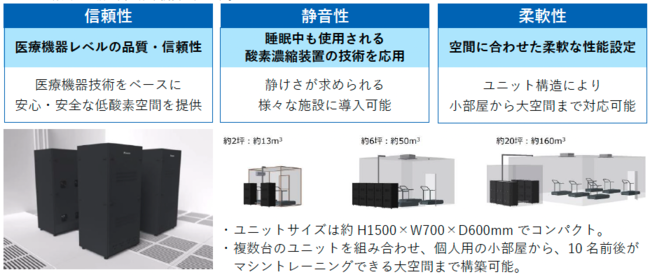 空気中の酸素と窒素を分離して酸素濃度をコントロールする技術を搭載した低酸素ユニットを、空間の大きさに応じて複数台組み合わせて構築するシステムです。ダイキン工業が従来から展開している医療用の酸素濃縮装置『ライトテック』の技術をベースにしたもので、信頼性、静音性、柔軟性に優れます。様々な規模の空間に活用できるほか、オフィス空間をはじめ、静けさを求められる場所にも適しています。また、酸素濃度を18%〜13%※2(標高1,200〜3,900メートル相当)の範囲でコントロールできるため、用途に応じた低酸素空間づくりが可能です。