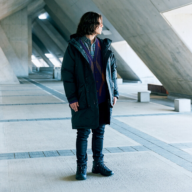オーロラダウンシリーズのデザインバリエーションとして、カジュアルなハーフコートもラインナップ。機能的かつクールな印象を与えるミリタリーテイストに味付けしました。中綿にはDXダウンをたっぷり150g封入しており、膝から上をしっかりと温めてくれます。