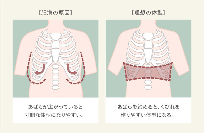 あばら骨(肋骨)が開いていると、内臓が下がりぎみになり「ずん胴」に見えます。「ととのうコルセット」の着用で物理的に骨格をサポートしてあばらを締めた状態では、ウエストの高い位置にくびれが生まれるだけでなく、足長に見えるというメリットもあります。“あばら締め”は最近、体型が気になる方を中心に注目されており、コルセットは着用するだけで手軽にあばら骨(肋骨)の補整が出来るアイテムとしておすすめです。しかも、毎日着用を続けることで無理なく正しい姿勢を保てるようになり、ボディラインだけでなく、気持ちまでスッキリと整います。