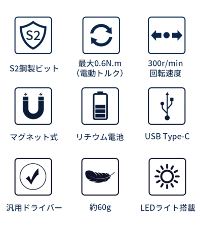 ※トルクとは回転軸を回転させる力のことで、数値が大きいほどネジを締める・緩めることが簡単になります。