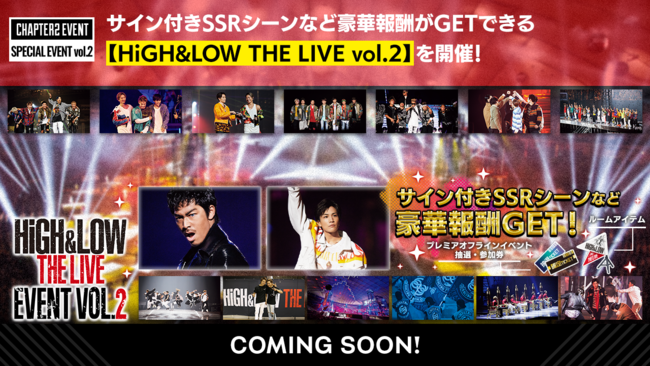 7月1日(金) 15時からランキングイベント【HiGH&LOW THE LIVE vol.2】を開催いたします。累計イベントpt報酬や、ランキング報酬ではサイン付きSSRシーンカードやゲーム対戦イベントへの抽選券・参加券を獲得することができます。イベントをプレイして豪華アイテムをGETしましょう。