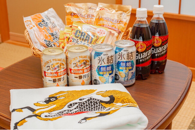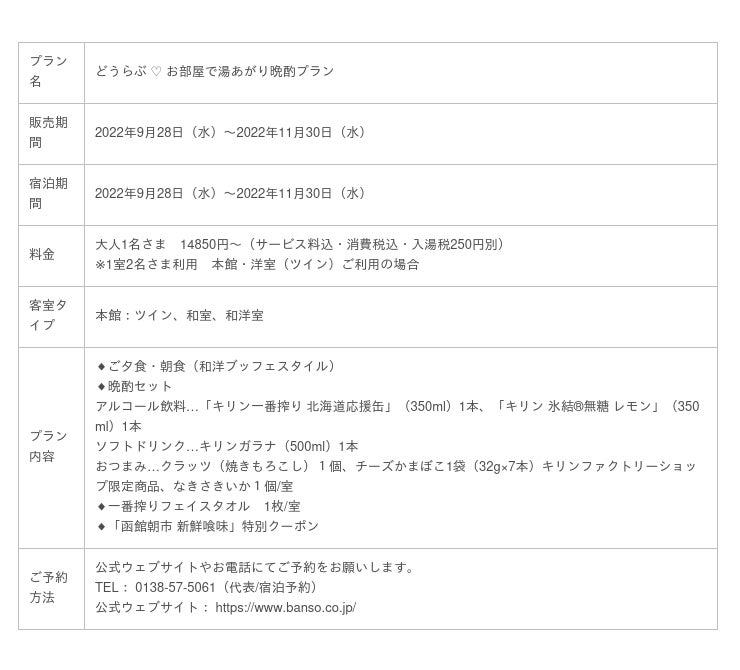 本プランは、お泊りいただくお部屋に「晩酌セット」をご用意し、温泉にゆっくり浸かっていただいた後の湯上がりに、「お部屋飲み」をしていただける内容となっています。「晩酌セット」には、北海道を一緒に盛り上げたいという志のあるキリンビール株式会社北海道統括本部と協働し、北海道限定デザインのビールや人気チューハイの他、同社の工場見学でしか通常提供していないスナック菓子をお酒のお供としてご用意しました。また、ホテル万惣がセレクトした、「函館朝市 新鮮喰味(しんせんぐみ)」で販売している「なきさきいか」もおつまみの一つとしてご賞味いただけます。