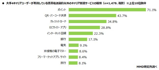 ■ 大手4キャリアユーザーが利用している携帯電話契約以外のキャリア関連サービス、トップは「ポイント」で71.1%、次いで「QR・バーコード決済」が43.7%