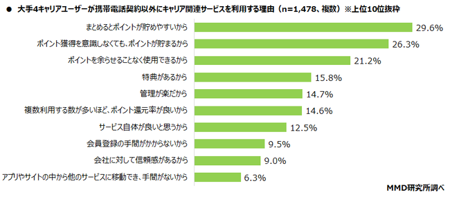 携帯電話契約以外のキャリア関連サービスを1個以上利用している1,478人を対象に、携帯電話契約以外の関連サービスを利用する理由を複数回答で聞いたところ、「まとめるとポイントが貯めやすいから」が29.6%と最も多く、次に「ポイント獲得を意識しなくても、ポイントが貯まるから」が26.3%、「ポイントを余らせることなく使用できるから」が21.2%となった。