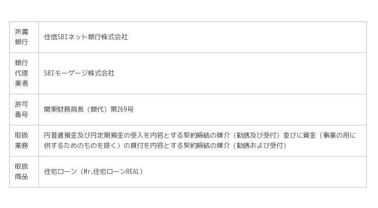 (※1)「Mr.住宅ローンREAL」は銀行代理業専用商品であり、住信SBIネット銀行が取り扱う「Mr.住宅ローン」、「ネット専用住宅ローン」とは異なる商品です。「Mr.住宅ローンREAL」はSBIモーゲージの取扱店舗を通じてお申込みいただくことができます。なお、お申込みから実行のお手続きや各種ご相談については、SBIモーゲージが窓口となり、融資実行後の各種お手続きにつきましては、住信SBIネット銀行が窓口となって対応いたします。