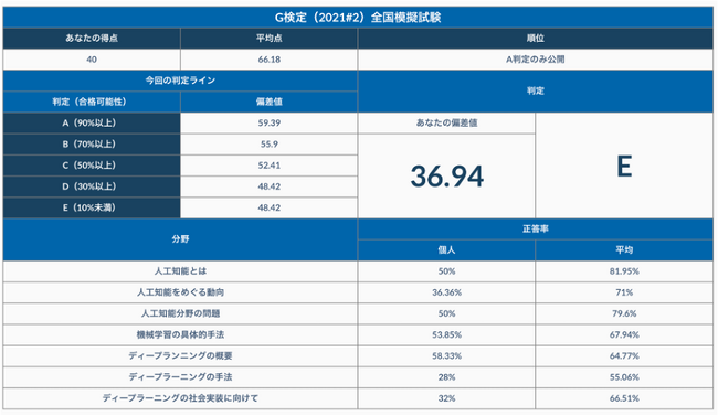 「G検定全国模擬試験」は、過去累計600名以上の方々に受験していただいており、模試受験者による本試験(G検定)の合格率も毎回80%以上と、JDLA全体の合格率を大きく上回る成果を記録しています。また、模擬試験の判定結果でB判定以上の受験者の本試験合格率も毎回9割を上回る高い結果となっており、「G検定」に向けた力試しと対策に大いにご活用いただいております。