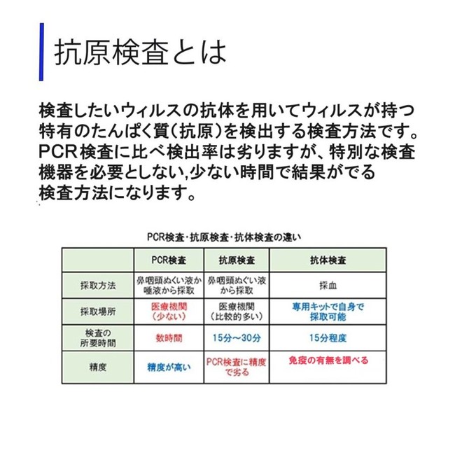 感染のリスクの伴う民間PCR検査に比べ職場での定期検査が可能で、その場で迅速に確認が出来るのが特徴の研究用抗原検査キットです。