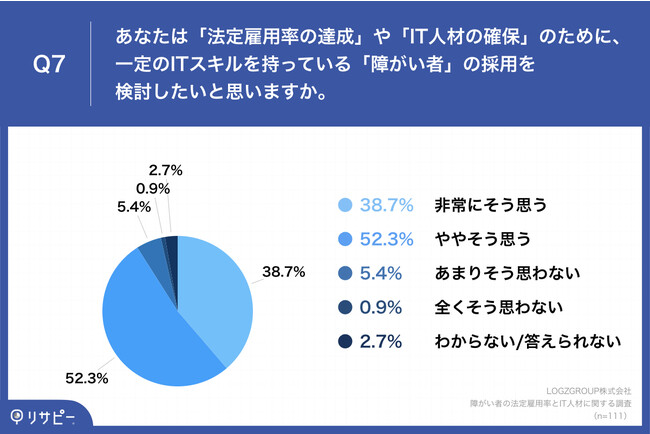 「Q7.あなたは「法定雇用率の達成」や「IT人材の確保」のために、一定のITスキルを持っている「障がい者」の採用を検討したいと思いますか。」(n=111)と質問したところ、「非常にそう思う」が38.7%、「ややそう思う」が52.3%という回答となりました。