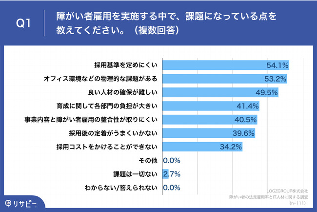 「Q1.障がい者雇用を実施する中で、課題になっている点を教えてください。(複数回答)」(n=111)と質問したところ、「採用基準を定めにくい」が54.1%、「オフィス環境などの物理的な課題がある」が53.2%、「良い人材の確保が難しい」が49.5%という回答となりました。