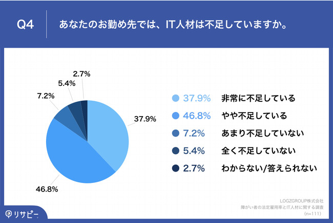 「Q4.あなたのお勤め先では、IT人材は不足していますか。」(n=111)と質問したところ、「非常に不足している」が37.9%、「やや不足している」が46.8%という回答となりました。