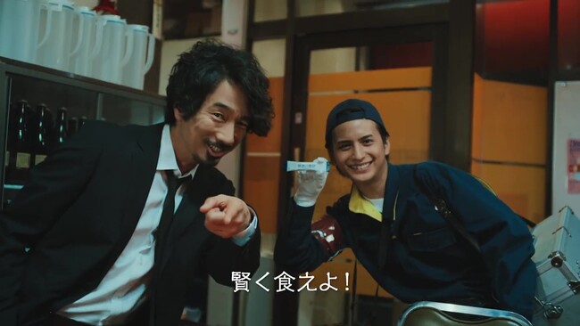 CMでは、刑事役の眞島秀和さんと鑑識役の中島健さんが町中華に出動。ラーメンを食べようとするお客さんに対して、糖質90g脂質13gと瞬時に見立て、ハマってしまう美味しさと食生活について気を付けるようアドバイスし、食事の糖分や脂肪が気になる方に「賢者の食卓 ダブルサポート」を活用して賢く食べることを提言します。市民の健康的な食生活を守るため、ワイルドさと優しさを持った刑事を眞島秀和さんが熱演します。