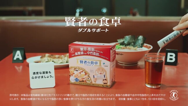 CMは、主にTVerのグルメ番組や刑事ドラマ、バラエティ番組で11月22日〜12月31日まで配信。地上波では、12月中旬以降にグルメ番組などの時間帯に放映。美味しいものを食べる機会の多い時期に、「賢者の食卓 ダブルサポート」が食生活をサポートすることをアピールします。