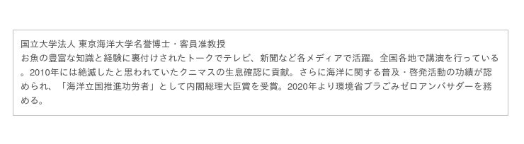 40分の配信が終わりに差しかかると、さかなクンは最後に「みんなと一緒にたくさんのことを考えることができてうれしいです。川や海に行ったときにごみを出さない、できることをしっかりしていきたいですね。一人でできることは小さなことですが、おうちの人やお友達、みんなで一緒にできたら大きな力になる。ぜひとも継続していきたい」とメッセージを送り、締めくくりました。