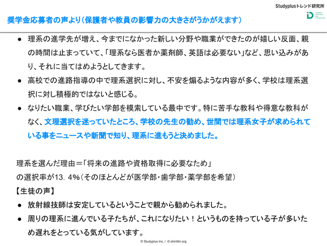 画像の声の3つ目にもありますが、決め手がなくて悩んでいた時に「社会から理系の女性が求められている」という情報があれば、求められているならチャレンジしようという勇気も湧いてくると思います。全国で入試の時点で、STEM分野に進学する女子枠が生まれていることや、私たちの奨学金も後押ししたい気持ちで提供しているので、ぜひ生徒に情報提供いただけると嬉しいです。