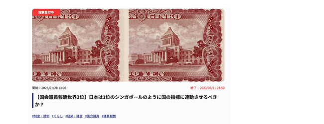 SNSとテクノロジーで社会課題の発見・解決をサポートするICTスタートアップのPolimill株式会社(ポリミル、本社:東京都港区、代表取締役:横田えり、以下Polimill社)は自社SNS【Surfvote】上で、「【国会議員報酬世界3位】日本は1位のシンガポールのように国の指標に連動させるべきか?」というテーマで意見投票を開始しました。(投票〆切:2023年3月31日)
