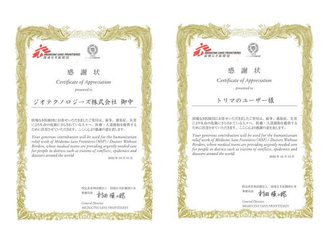 ジオテクノロジーズに、「国境なき医師団」から感謝状が届く